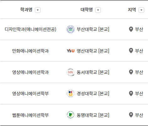 부산지역 만화/애니 관련 학과가 있는 대학은 다음과 같스비다.